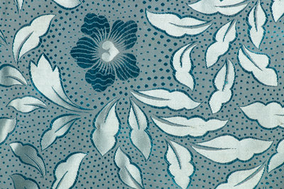 the body woven in a light blue damask, the interior fully lined to the cuffs with fur in an alternating cream and ivory color.