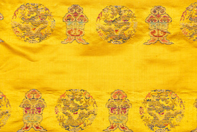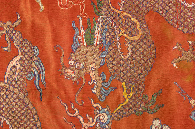 comprising a large bolt of lime-green yardage woven with a pattern of narcissus interpolated with butterflies and floral medallions, an orange ground example woven with rows of alternating pendant banners and dragon roundels, an orange ground rectangular panel depicting a front-facing dragon pursuing a flaming pearl flanked below by two further beasts in profile, padded and mounted to a blue satin backing, and an export valance in the 'Chinoiserie' taste.