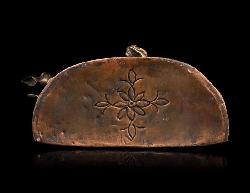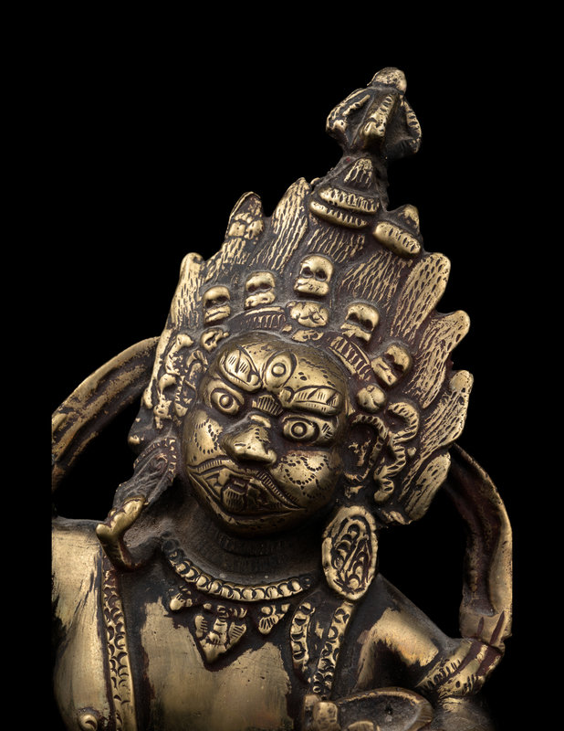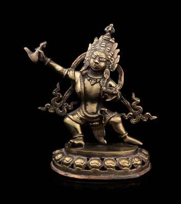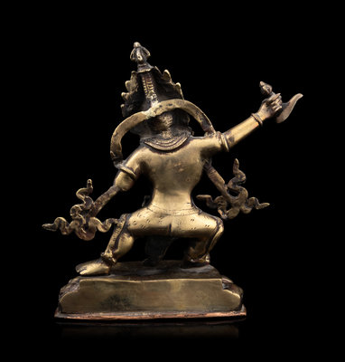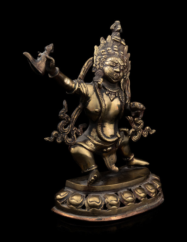 the figure depicted standing on a single-lotus base with both feet apart, the body slightly turned to the side and adorned with beaded jewelry, the face cast with a fierce expression underneath an elaborate crown and flanked by a pair of large earrings.