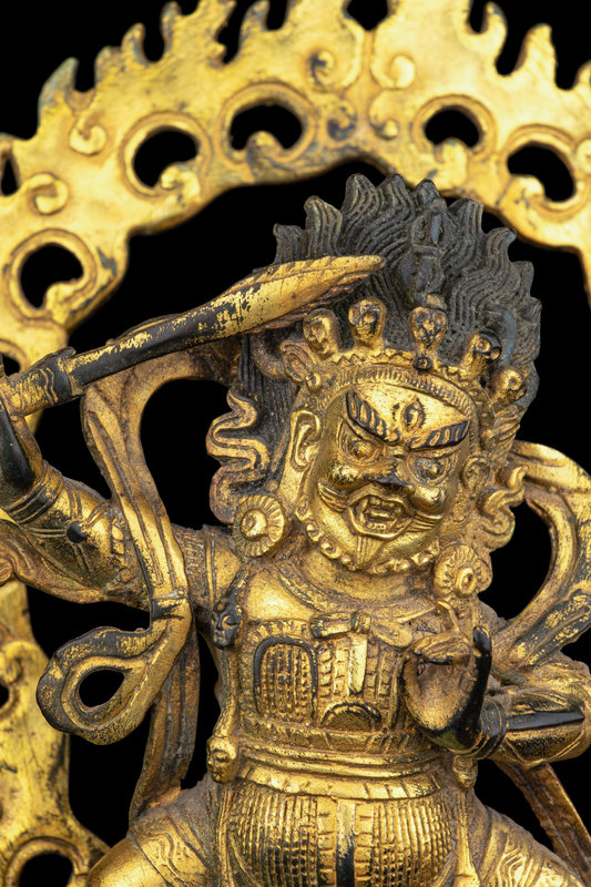 the wrathful figure depicted in a wide lunge, balanced across a human and deer, cloaked in armor and a fluttering cape, all while brandishing a sword. The whole all above a lotus plinth and backed by a flaming mandorla.