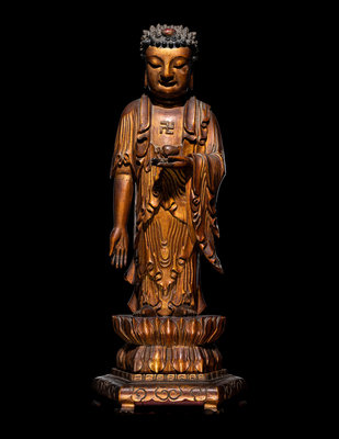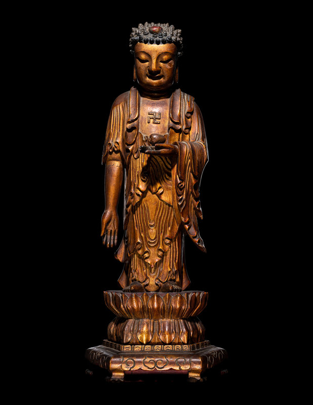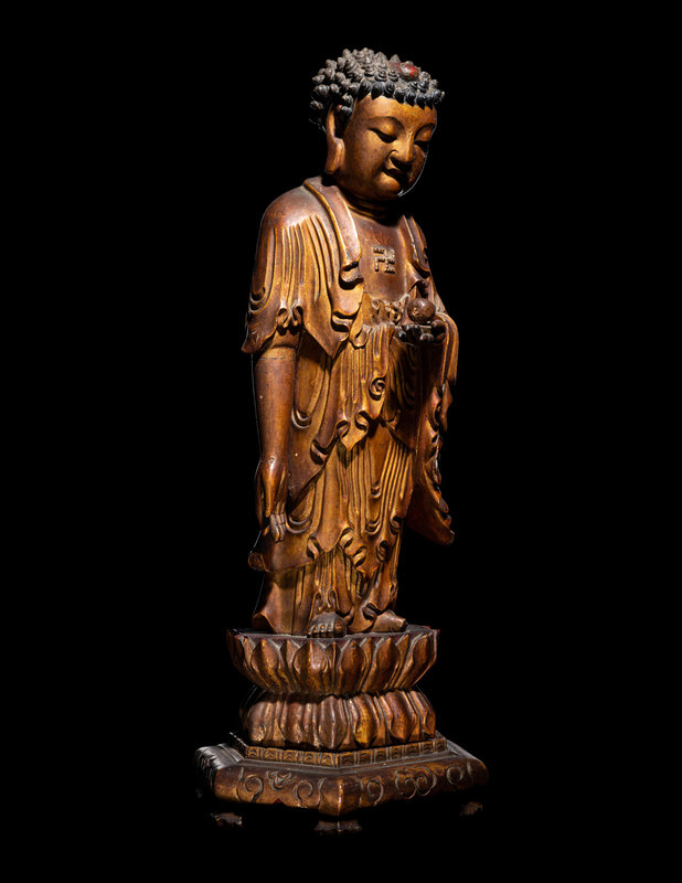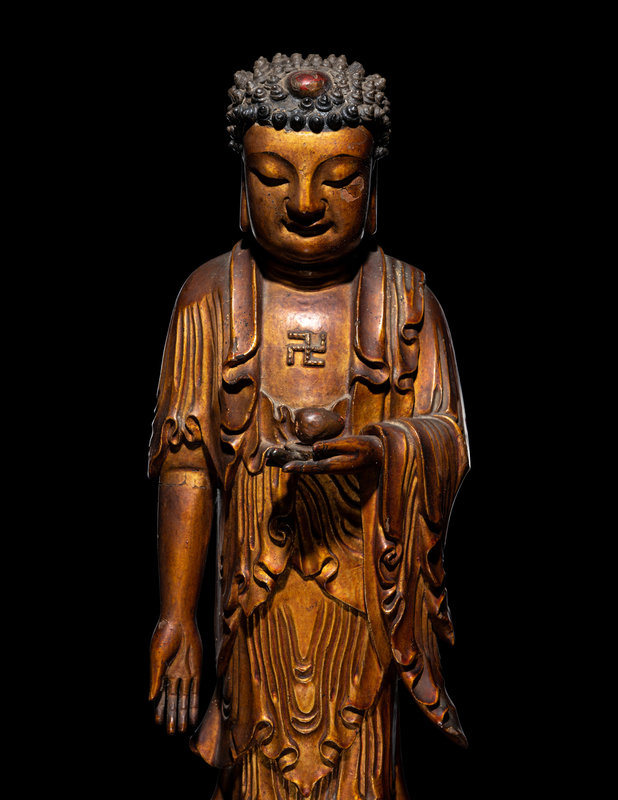 depicted standing in a varadamudra gesture and holding a myrobalan above a double lotus above a hexagonal stand incised with ruyi cloud motifs. The figure clad in long draping garments parting at the chest to reveal an auspicious wan symbol before cascading in the crook of the left arm and setting in ripples near the bare feet, and with a gentle downcast expression beneath tight coils surrounding a red-lacquered ushnisha.
