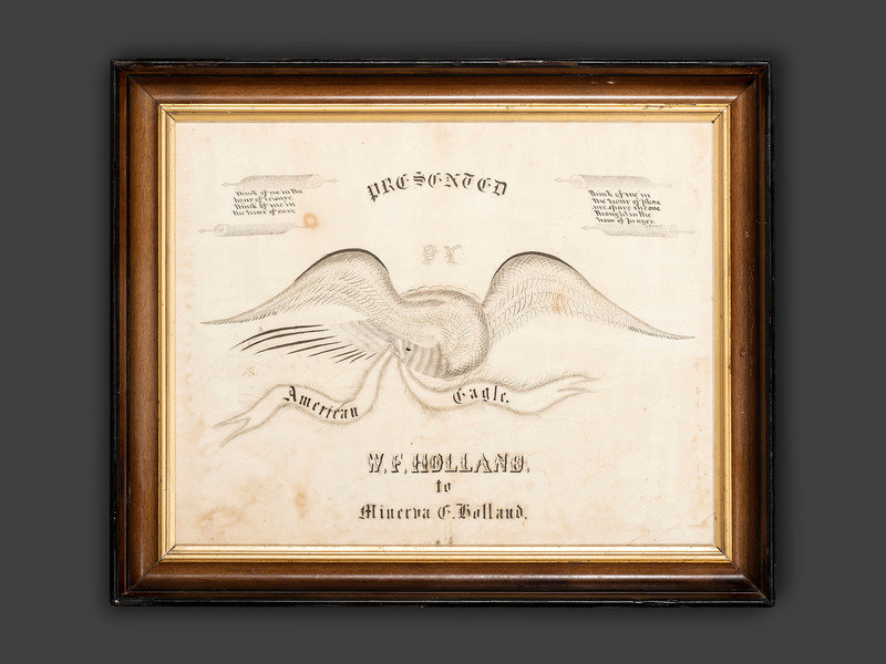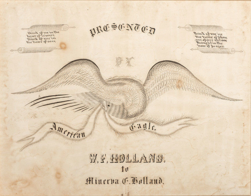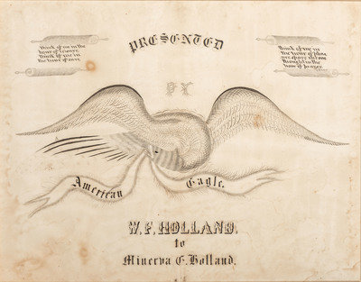 presented by W.F. Holland to Minerva Holland and inscribed Think of me in the / hour of leisure / think of me in / the hour of care / think of me in / the house of pleas / -ure, spare me one / thought in the / hour of prayer / W.F. Holland.