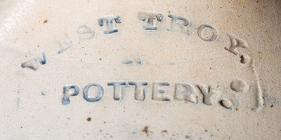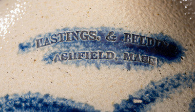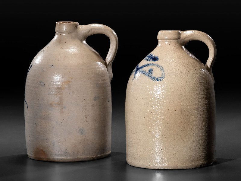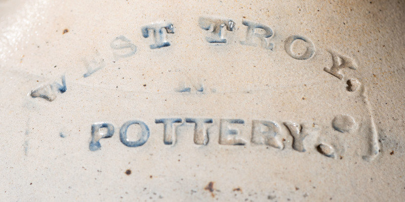 including a Hastings & Belding, Ashfield, Massachusetts jug with cobalt eye decoration and a West Troy Pottery jug with cobalt capacity mark.