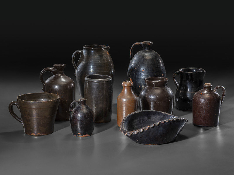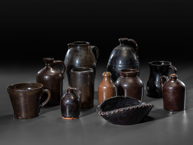 Eleven Albany Slip Stoneware and Redware Vessels