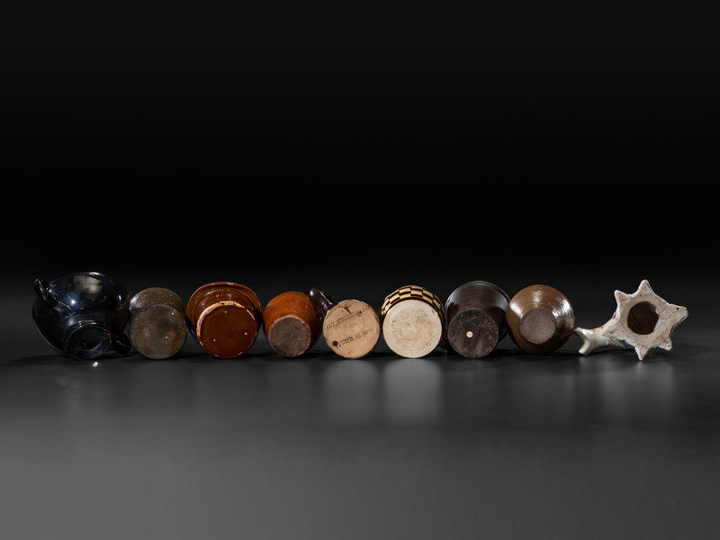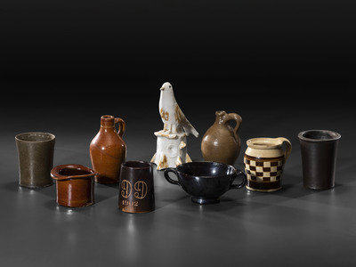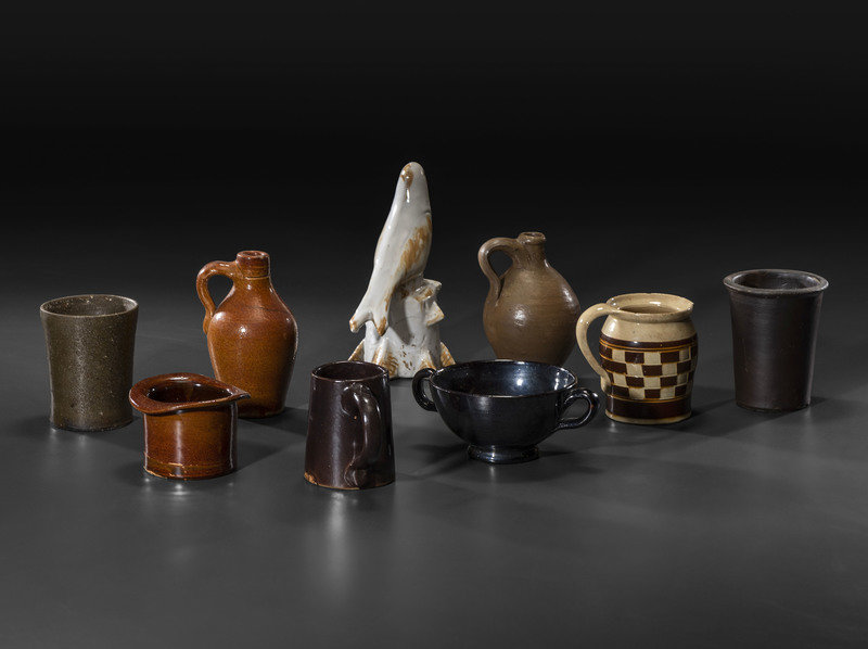 comprising a checkered mochaware cream pitcher, a Harvard reunion mug incised 99 / 1902, a rare Pennsylvania hand molded bird on stump, and six redware and stoneware vessels.