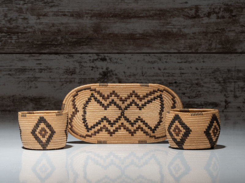 two baskets with diamond motif on body and hatch marks along rim; each height 1-3/4 inches x diameter 2-1/2 inches
