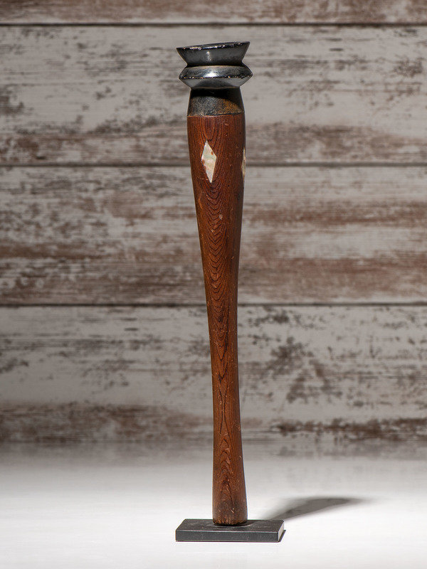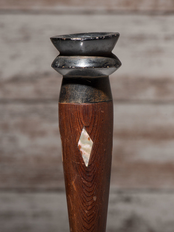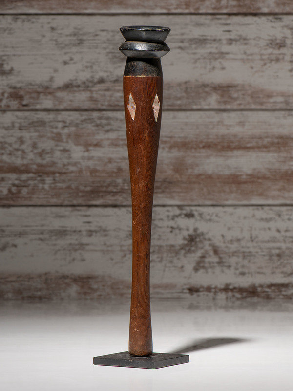 having a tapered form; steatite bowl; stem is embellished with four pieces of abalone shell