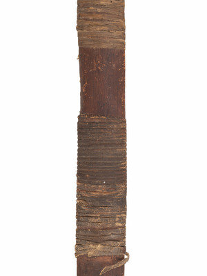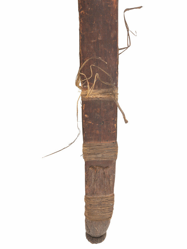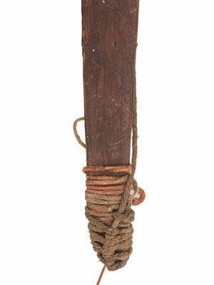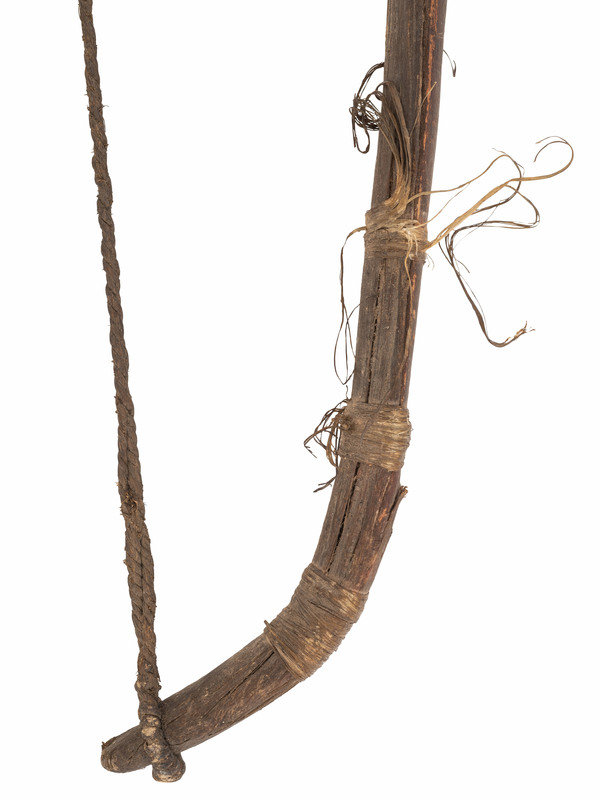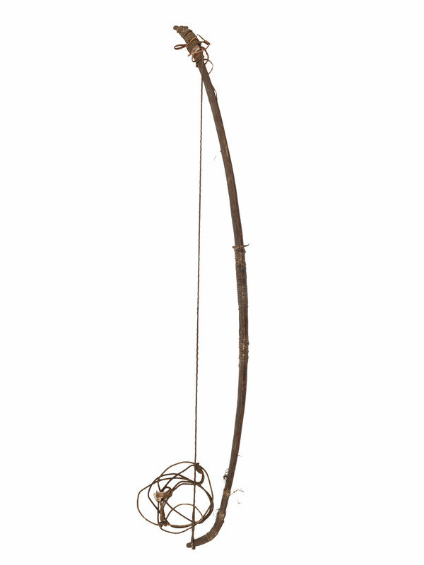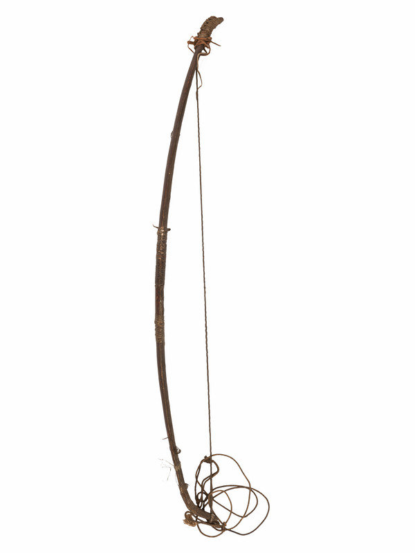 recurve bow with hide-wrapped grip and hooked nocks; twisted sinew string, length 39 inches.