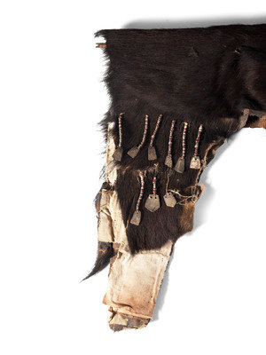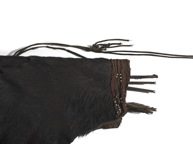 relic hide quiver embellished with strands of white and red white-heart glass pony beads terminating with cut abalone shell pendants, length 32 inches