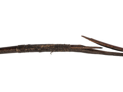 includes a cracked recurve bow with wrapped hide grip and hooked nocks; length 39-1/4 inches; PLUS eight arrows, some without points, average length 31 inches
