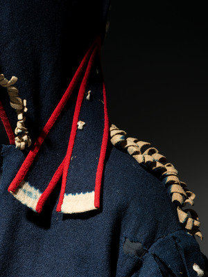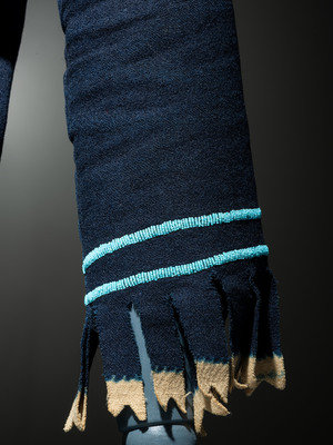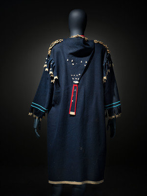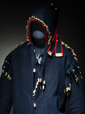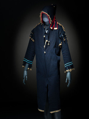 navy wool with cream salvage; cuffs decorated in a double row of small faceted light blue beads; hood with ermine skin embellishments
