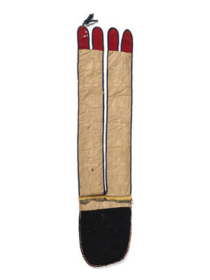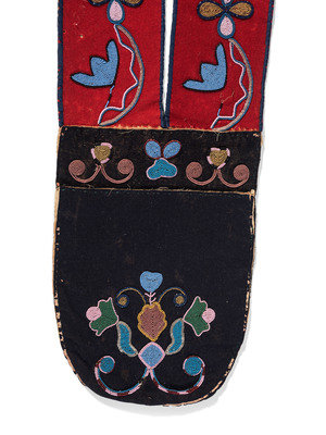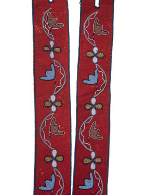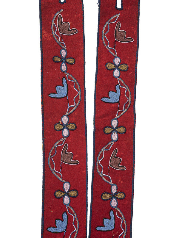thread and sinew-sewn red and navy trade wool; delicate floral designs executed using small and faceted glass beads; backed with polished cotton