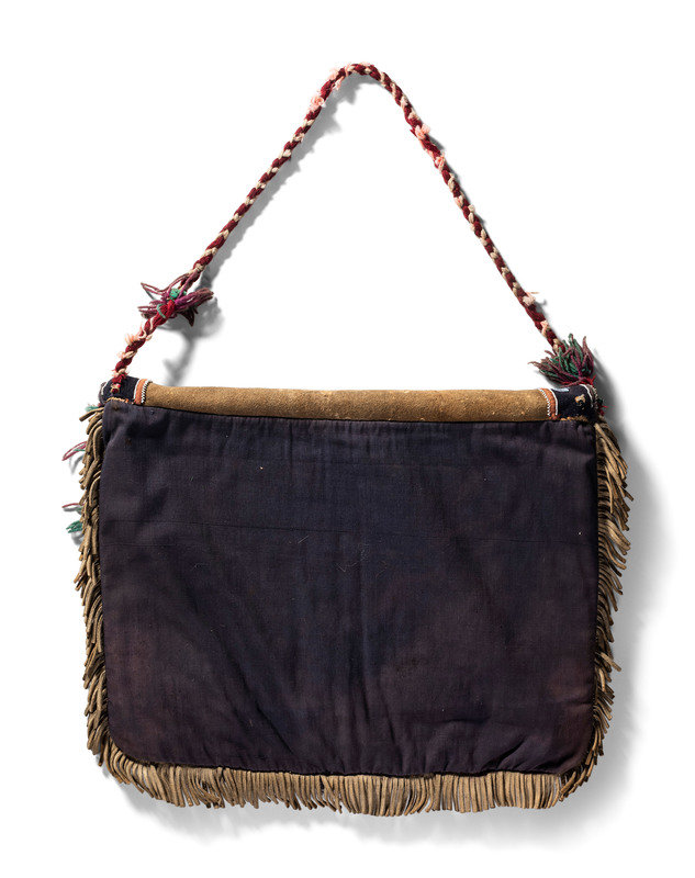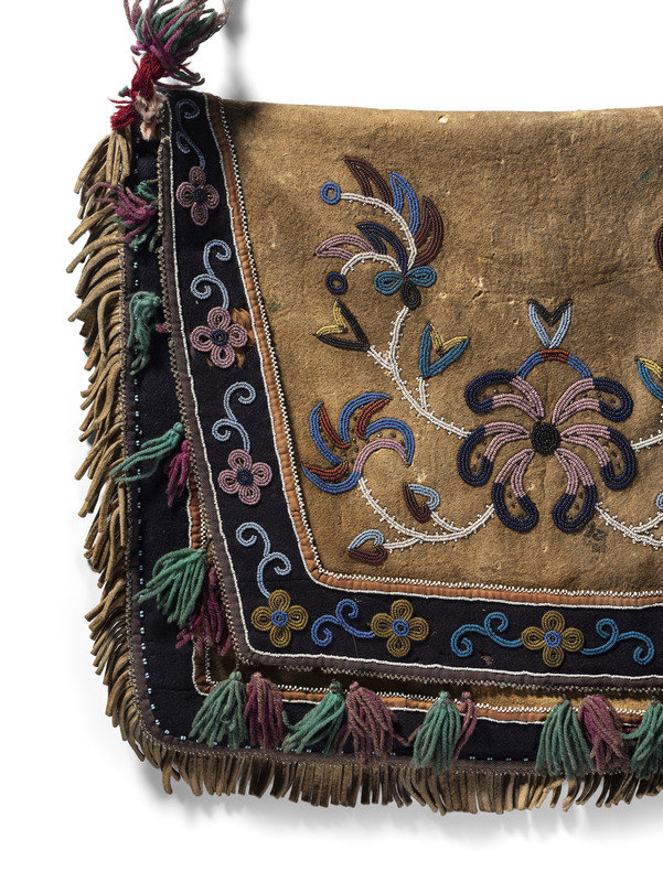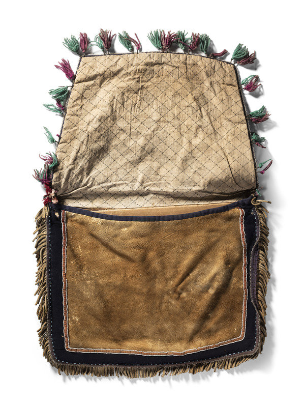 thread-sewn on softly tanned hide; interior lined with cotton cloth; beaded floral design on closing flap in colors of cobalt, greasy pink, back, white, red white-heart, periwinkle, greasy blue, translucent gold; wool yarn tufts