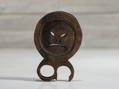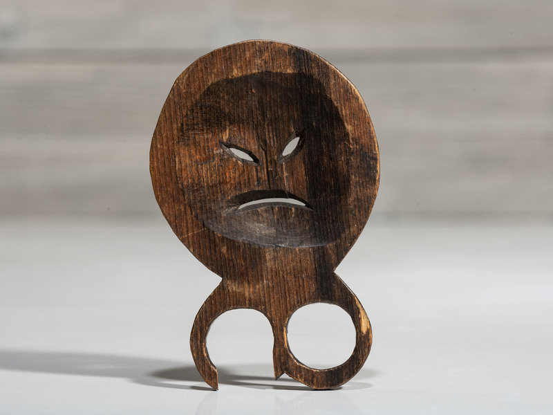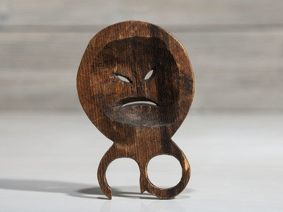 double ring cutouts; circular face carved with a downturned mouth; small hole along upper edge for attachment
