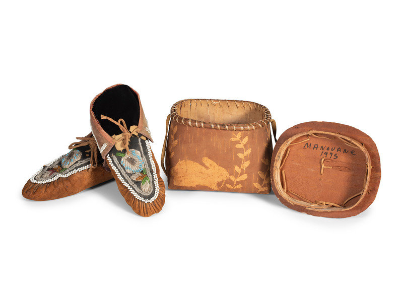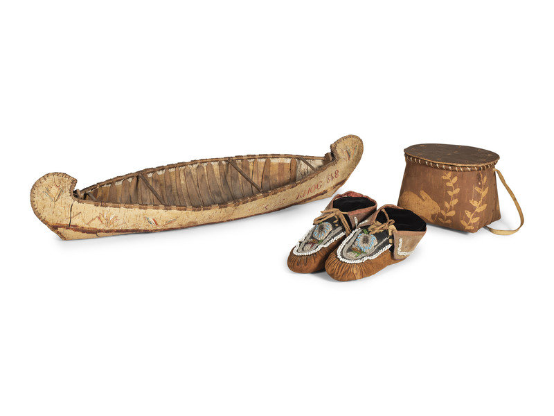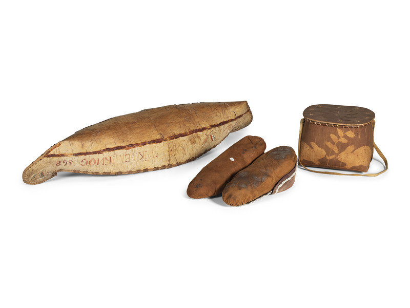 Great Lakes Birchbark Canoe, Basket, and Moccasins