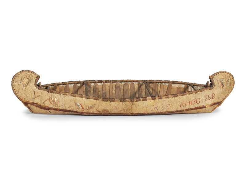 a birchbark canoe with Wikwemiknog 1868, quilled along side