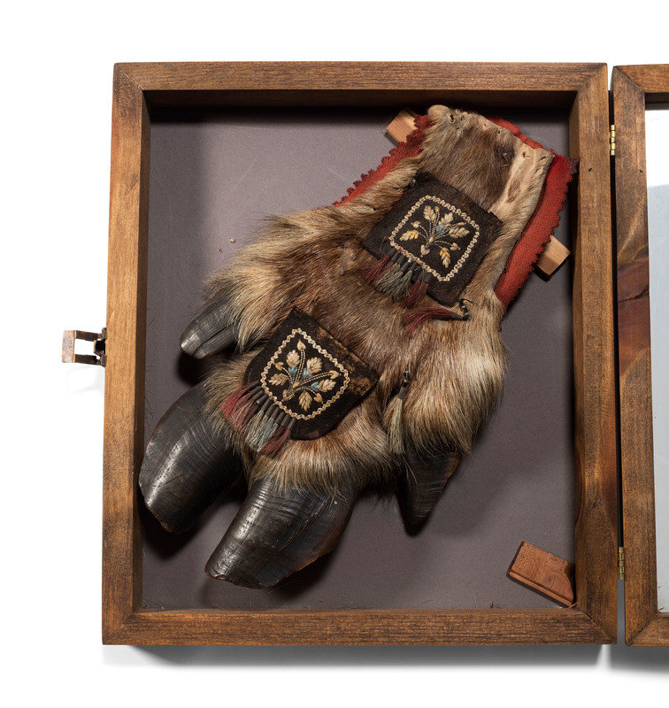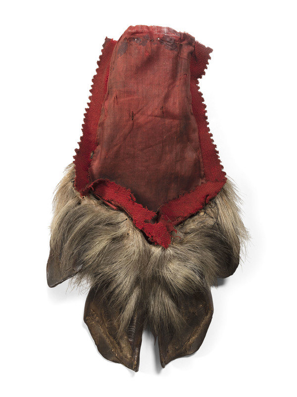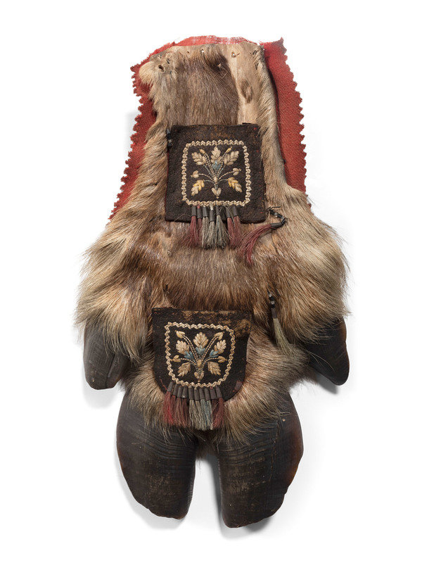 ornamented with panels of floral embroidery and finished with metal cones; backed with red wool