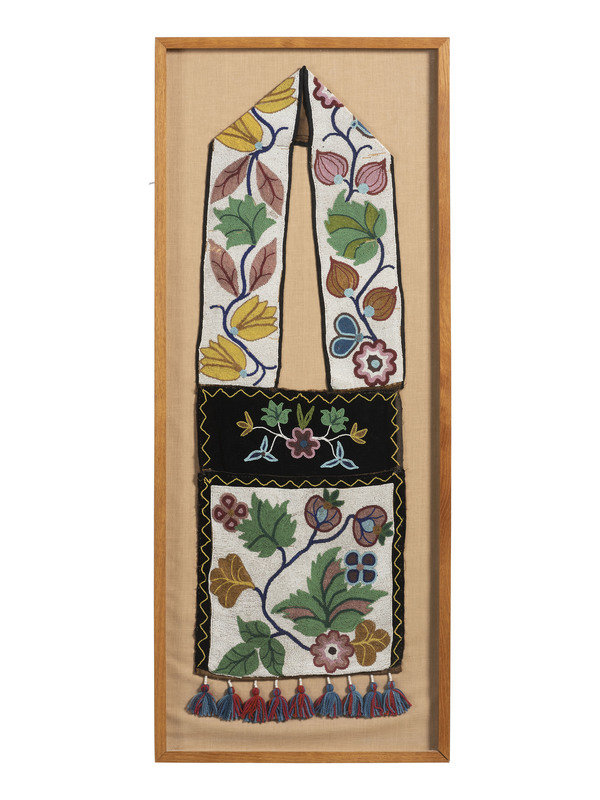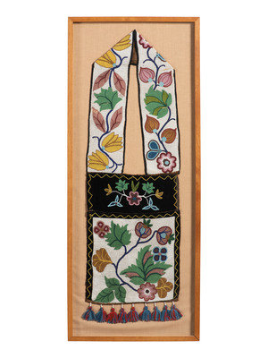 thread-sewn and beaded with a floral design using assorted colors of reds, greens, blues, yellows, and white; housed in a glass frame