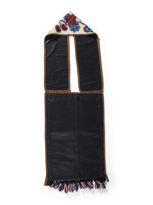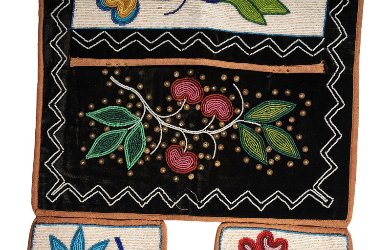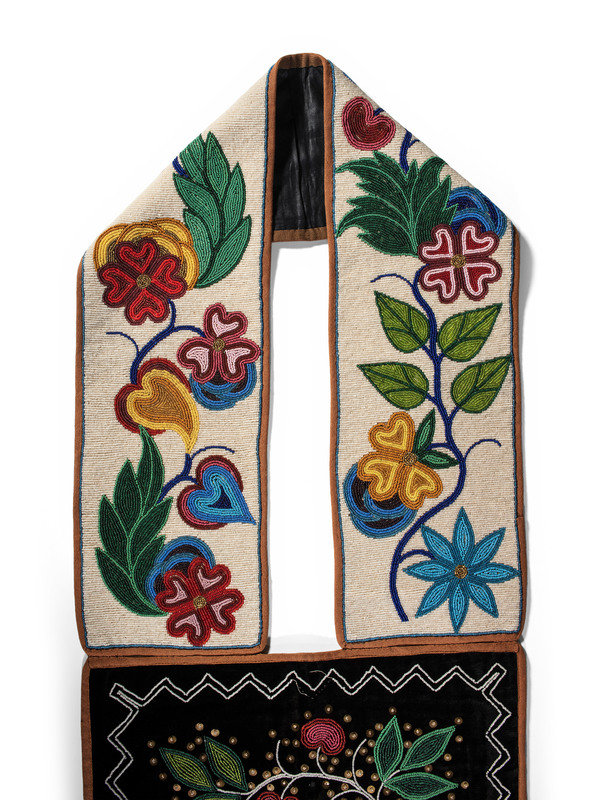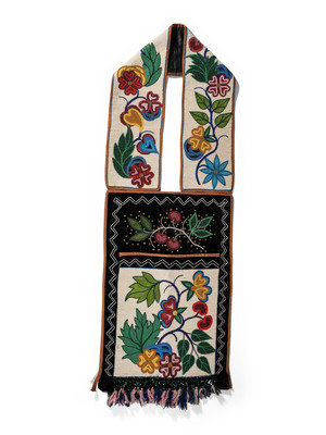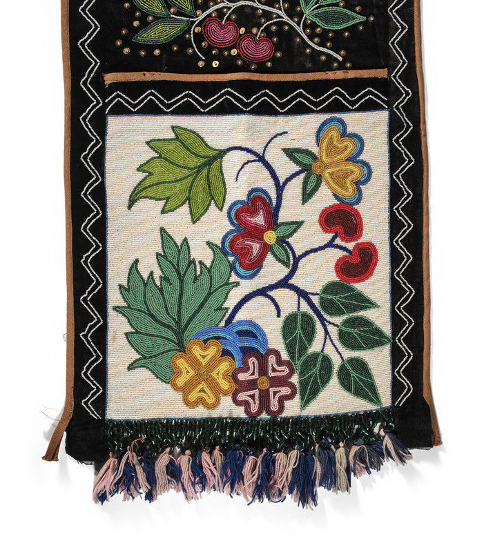 having a floral design in bold colors on a black velvet ground; translucent green tubular bead and yarn pompom fringe