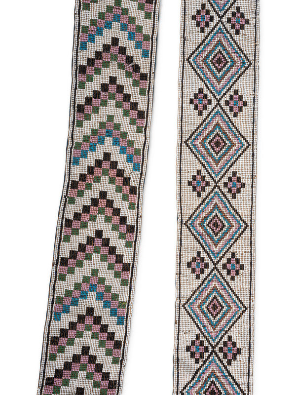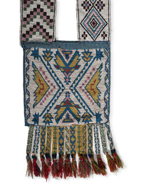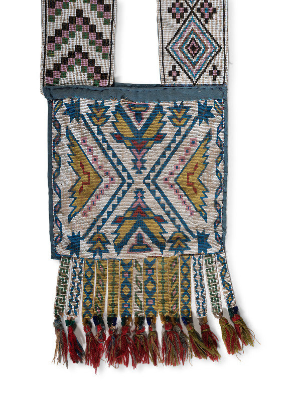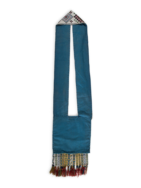 thread-sewn and backed with a blue cotton cloth; strap beaded on one side with a chevron pattern, the other with diamonds in colors of black, light pink, pea green, and light blue against a white ground; the panel beaded in a geometric design in colors of greasy yellow, greasy blue, pink, and red white-heart against a white ground; the lower edge lined with beaded fringe each with attached yarn tassel