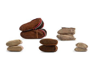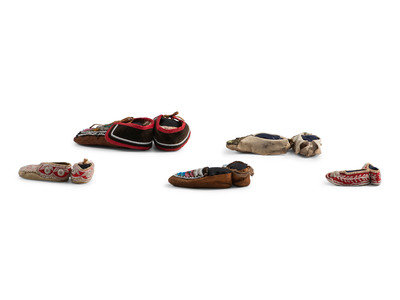 a child's pair; thread-sewn on hide; vamps lined with velvet and beaded in colors of white, translucent, translucent burgundy, pink, greasy blue and light blue