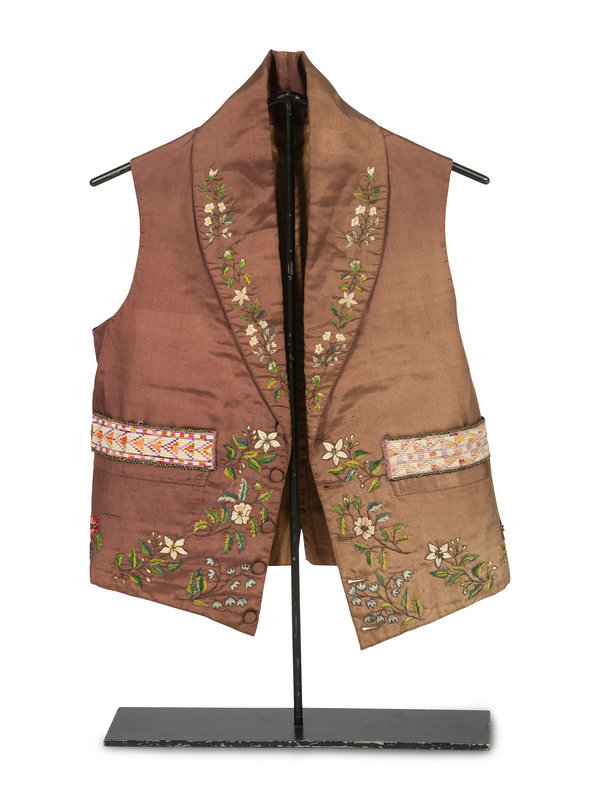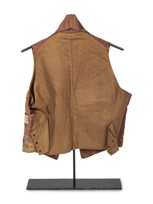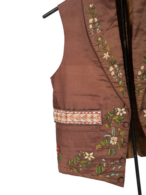 a cotton vest with brightly embroidered floral design and geometric quilled design on pockets