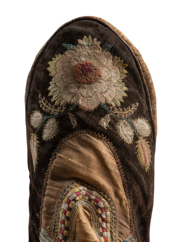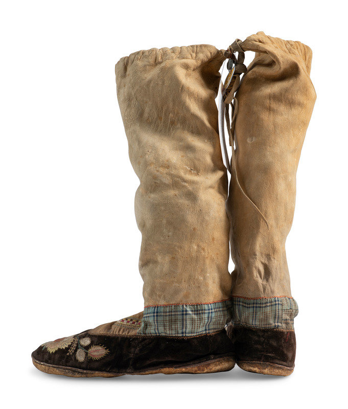 a pair of moccasins, thread-sewn on hide edged with velvet; vamps with embroidered floral motif; the cuff patched together with pattern cotton cloth