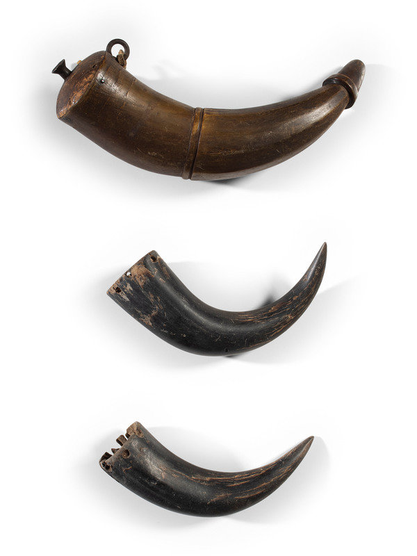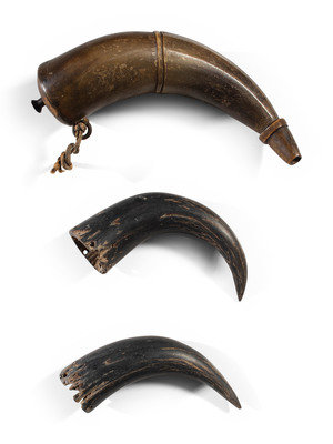 two undecorated horns, pierced at opening for attachments