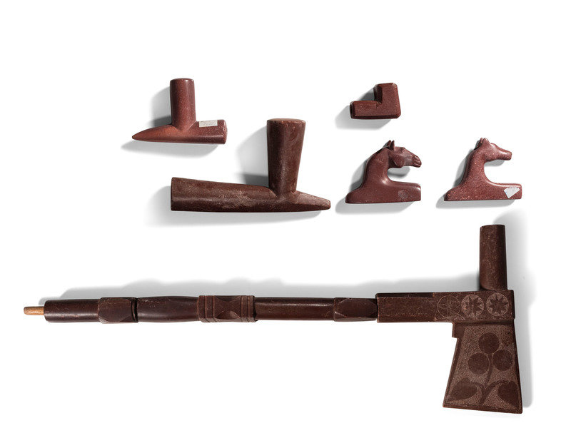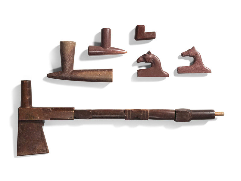 a tomahawk carved pipe bowl with carved catlinite stem