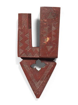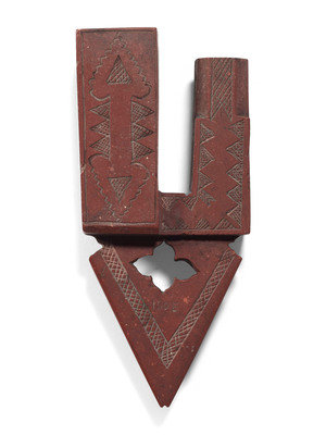 carved with a triangular keel having a floral cutout; angular body incised with crosshatched geometrics; dated 1905