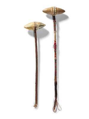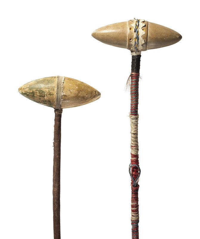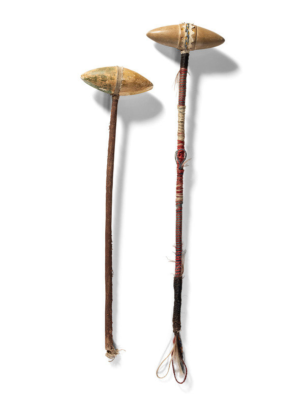 a club with biconical head, decorated with two bands of dots; haft wrapped with colorful horsehair