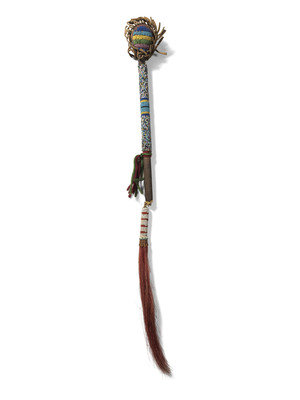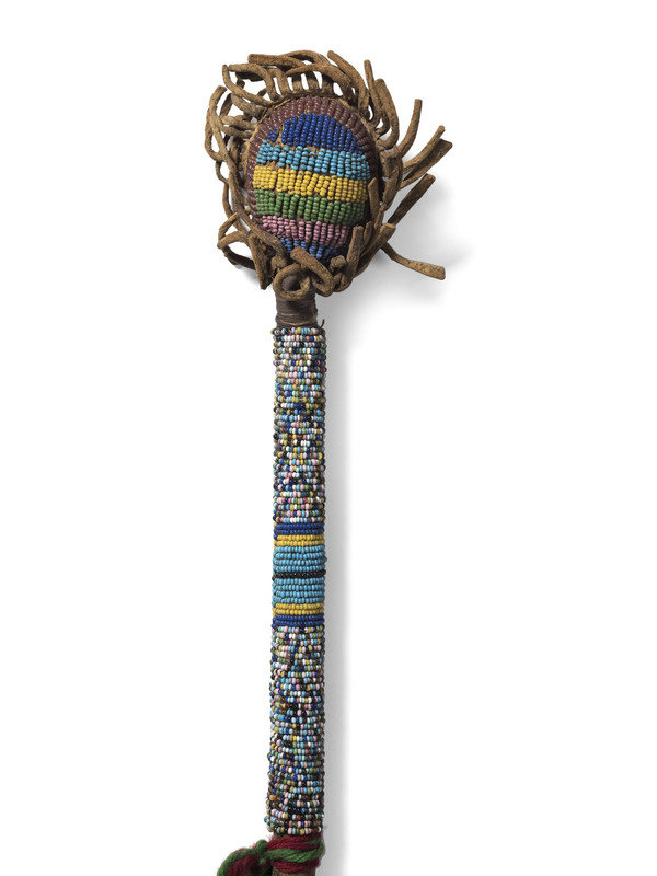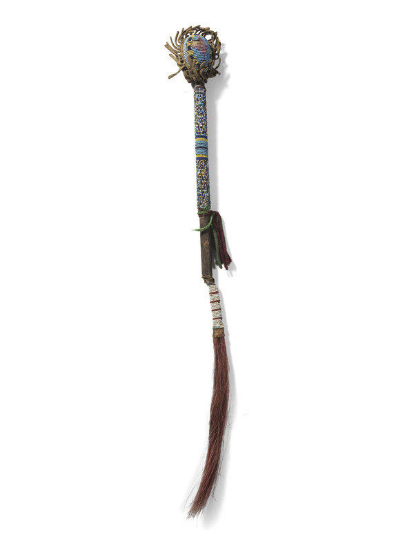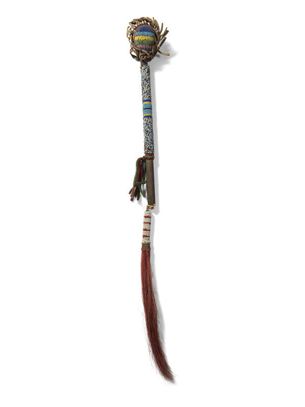 thread and sinew-sewn with dyed horsehair drop; wooden haft wrapped with rawhide and further embellished with salt and pepper bead work; linear beaded designs and hide fringe decorate the head