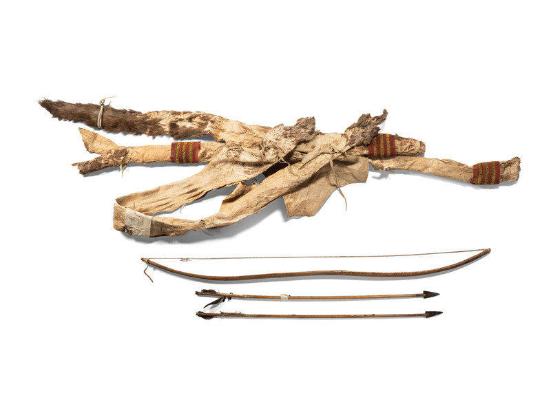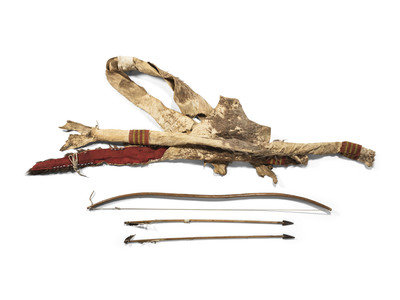 a bowcase and quiver, sinew-sewn and embellished with red wool trade cloth and greasy yellow, pony trader blue, and white beads