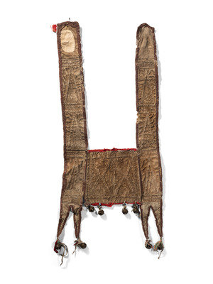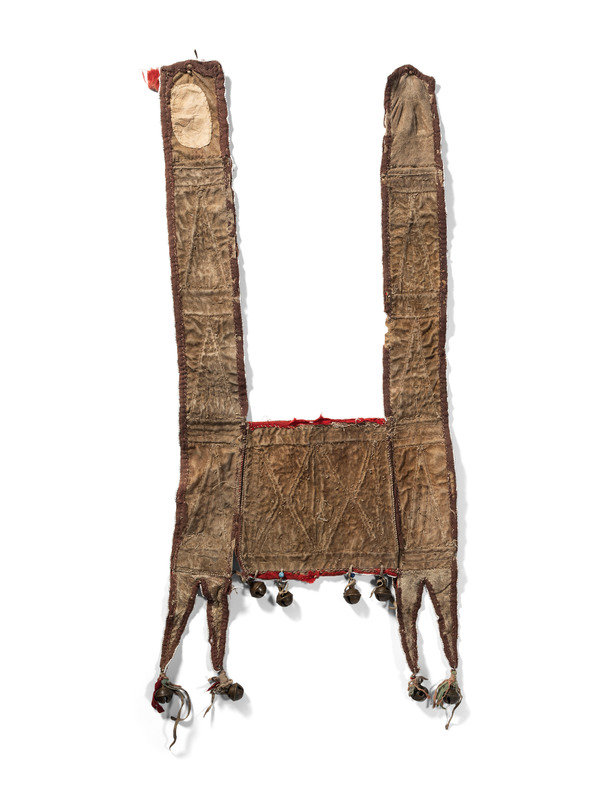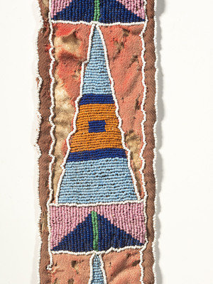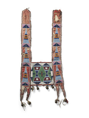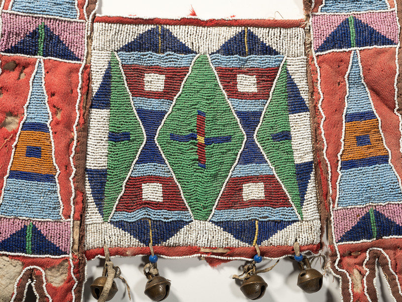 thread and sinew-sewn on hide, lined and edged with red trade wool; beaded geometric designs in colors of medium green, light blue, pink, pumpkin, navy blue, white, and red white-hearts; forked drops with brass bells