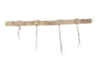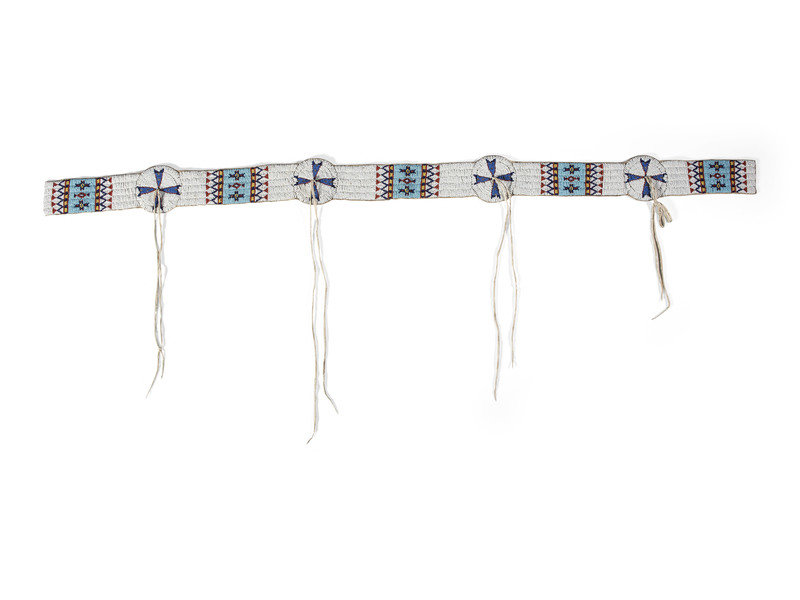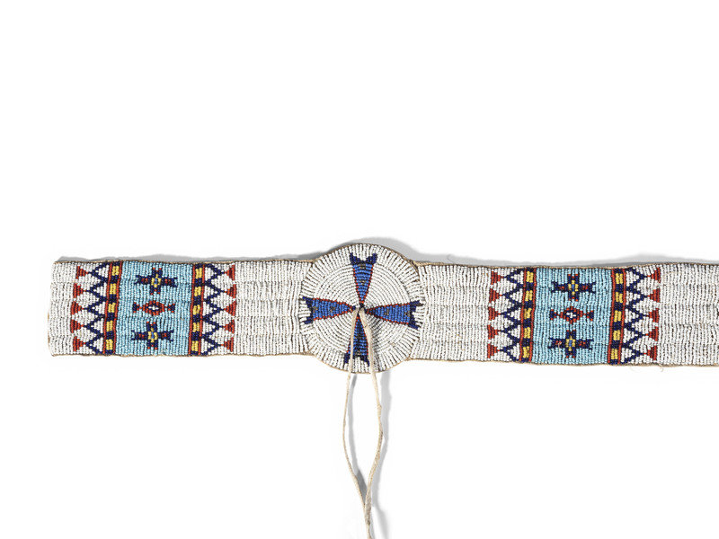 sinew-sewn and beaded in colors of apple red white-heart, cobalt, light blue, yellow, white, and marcasite