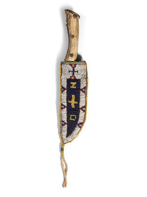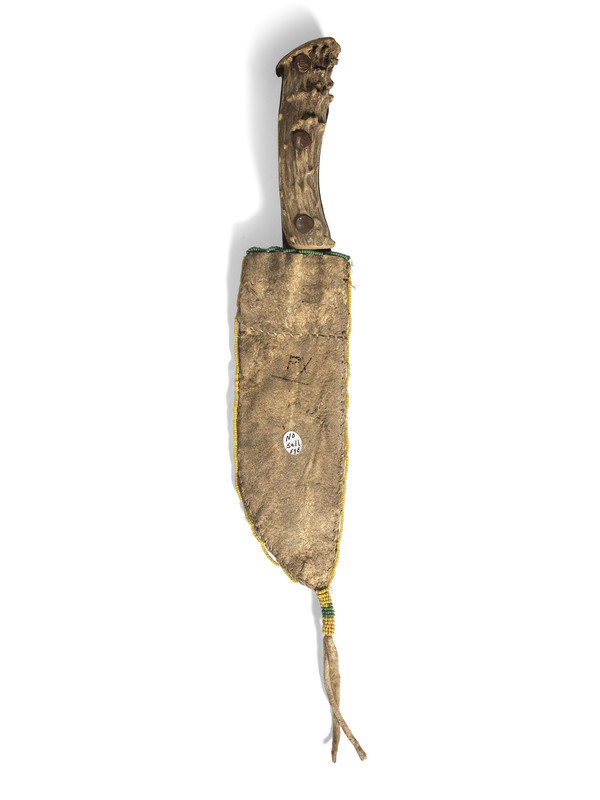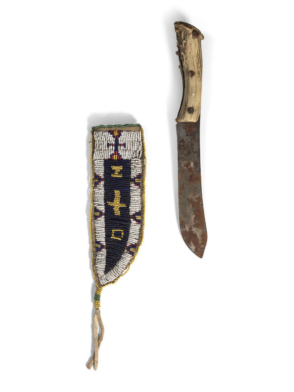 Sioux Beaded Buffalo Hide Knife Sheath and Antler Handle Knife