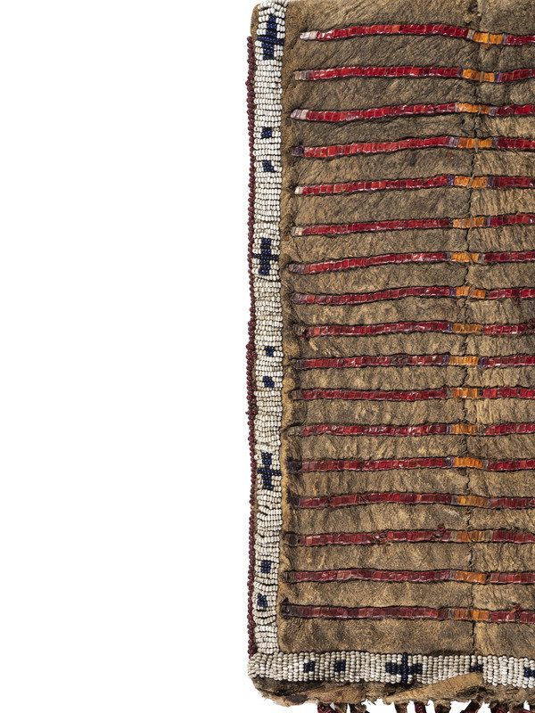 thread and sinew-sewn; having beadwork in colors of white, cobalt, and rose; both sides with quilled rows in red, orange, and purple