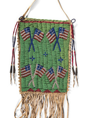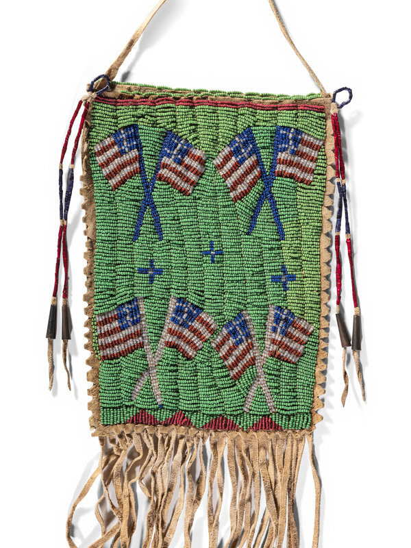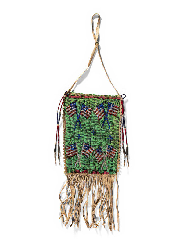 sinew-sewn and beaded in colors of pea green, opalescent, dark blue, and red white-heart; front of bag designed with four pairs of crossed American flags