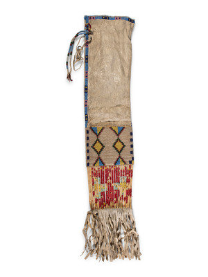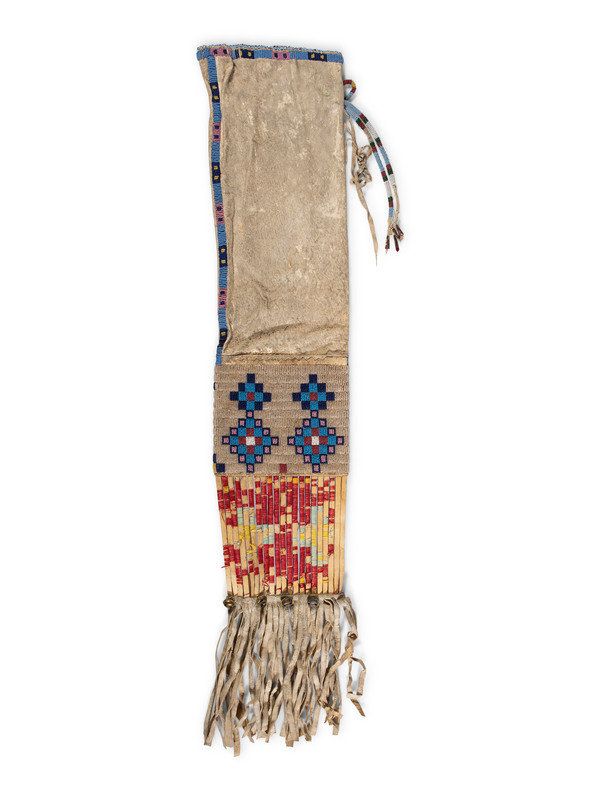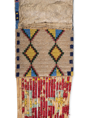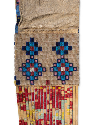 thread and sinew-sewn; beaded linear elements line the edges terminating into a beaded panel at the bottom, in colors of greasy yellow, periwinkle, translucent green, translucent burgundy, red white-heart, navy blue, and light pink against a translucent backdrop; remnants of brightly quilled slats with hide fringe line the lower edge