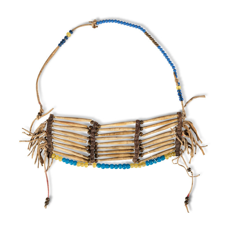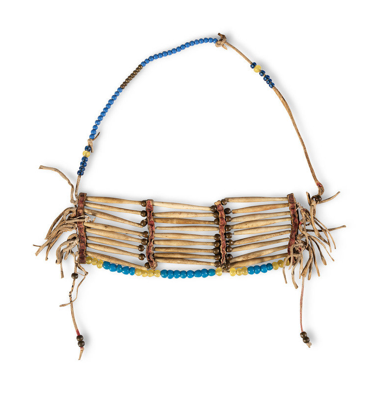 softly tanned hide neckstrap and fringe; three sets of bone hairpipes are separated by thick hide spacers coated in red pigment and brass beads