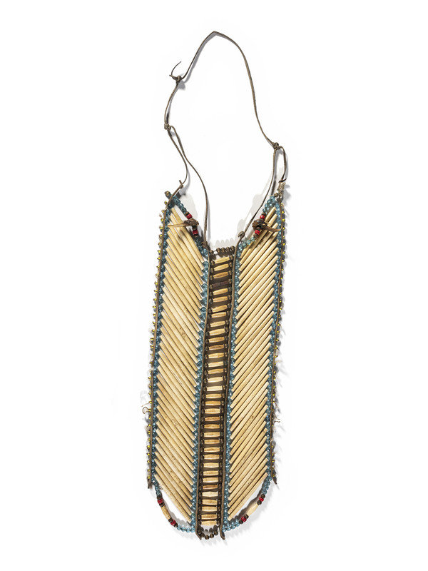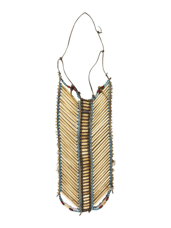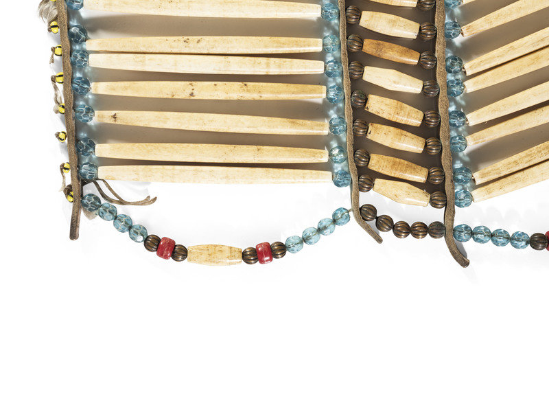 featuring three columns of bone hairpipes spaced with harness leather and accented with brass and faceted translucent blue beads