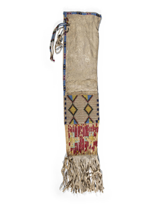 sinew-sewn on hide, and beaded with linear and cross designs in colors of greasy pink, greasy yellow, pea green, light blue, red white-heart, navy blue, black, and white