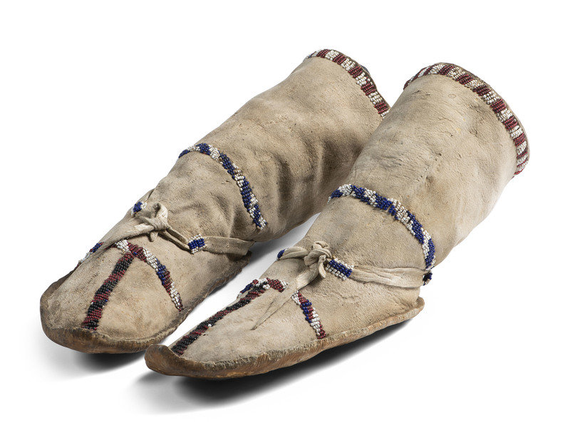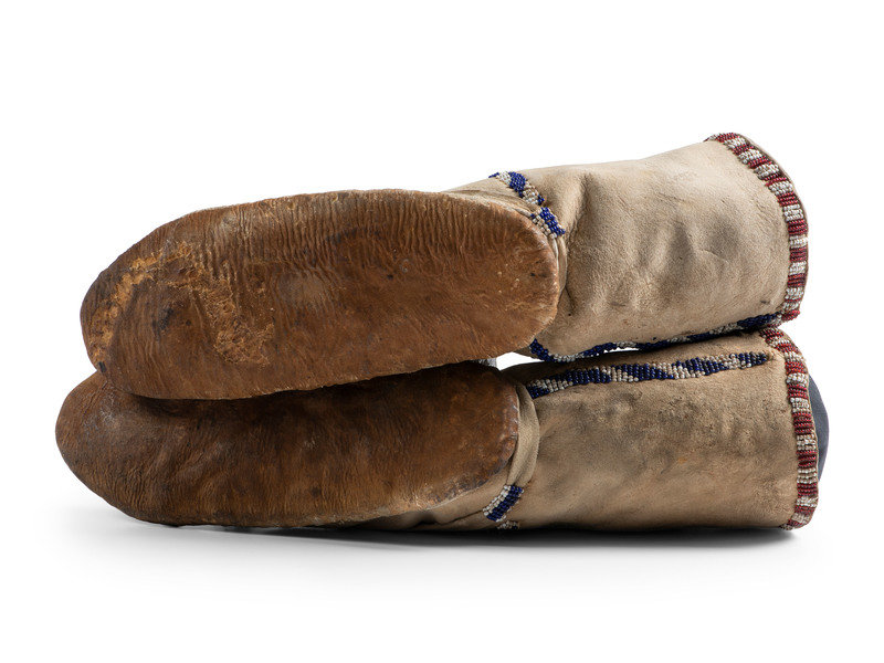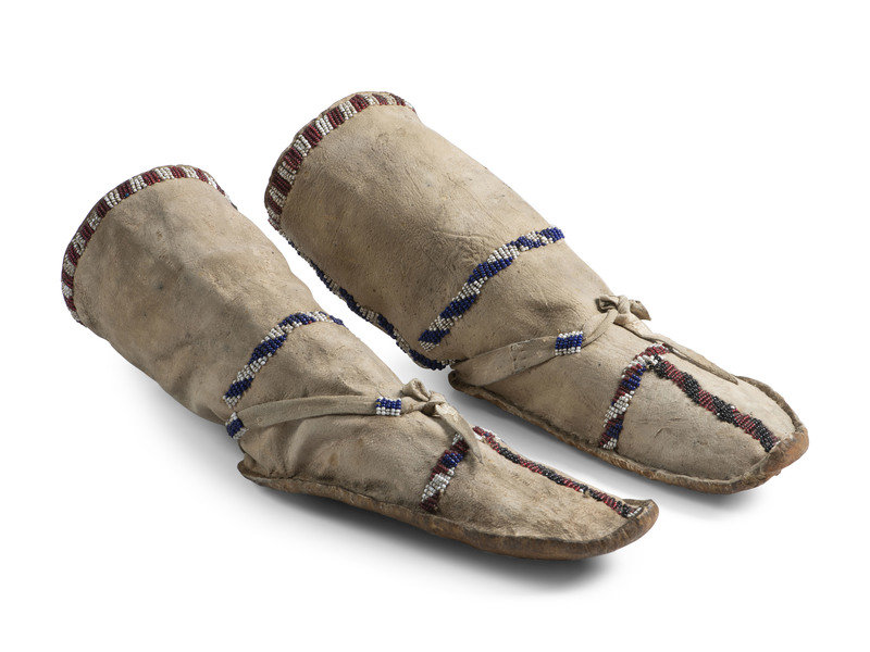 sinew-sewn and beaded with colors of dark blue, rose, white, and cobalt