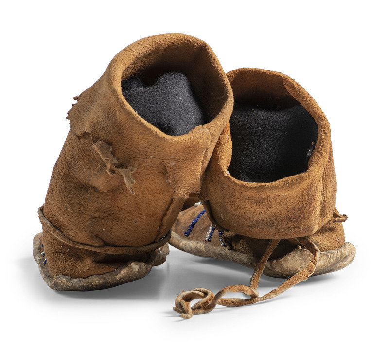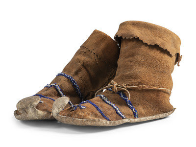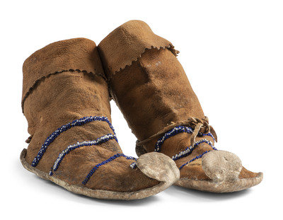 thread and sinew-sewn on thick hide with hard soles; cuffs featuring a pinked edges; vamps feature navy blue and white linear and cross beaded design