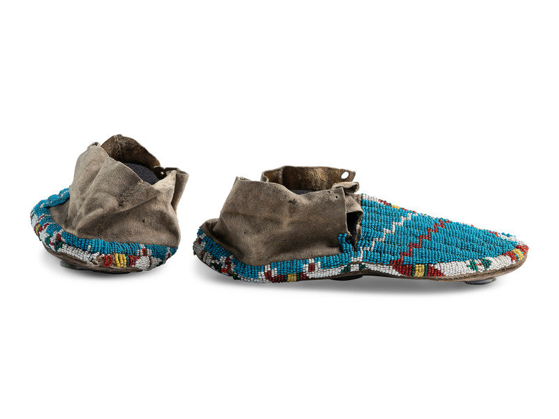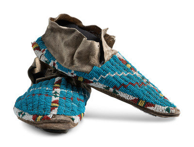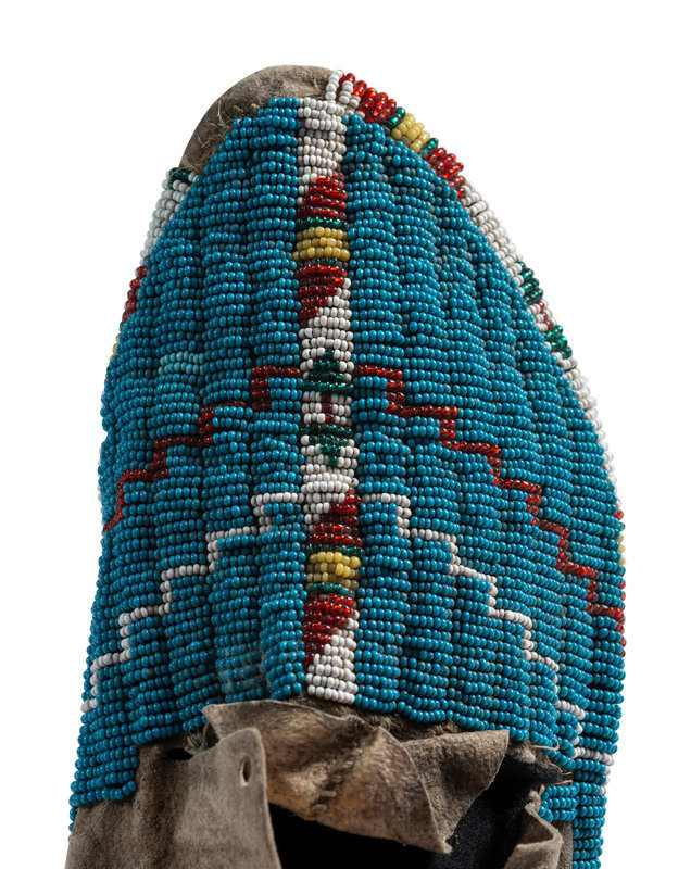 thread and sinew-sewn and beaded using colors of medium blue, rose, white, translucent green, and white