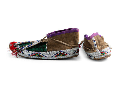 sinew-sewn and beaded using colors of translucent green, dark blue, red, and white; bifurcated tongues embellished with tin cones and red-dyed feathers; cuffs edged with purple ribbon