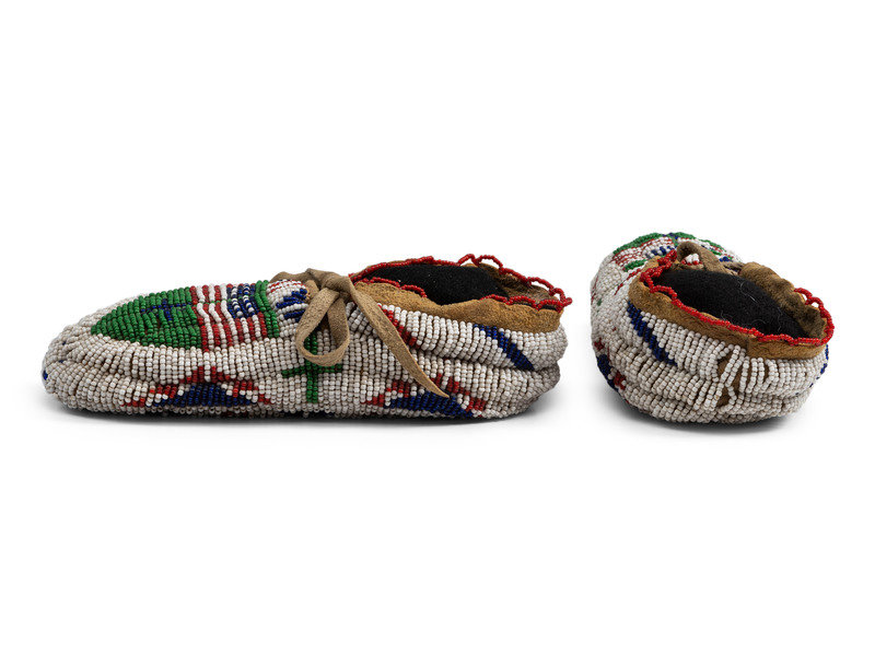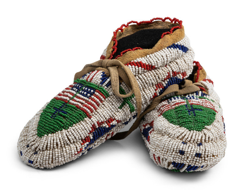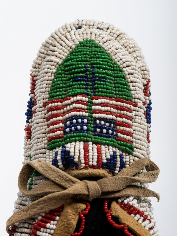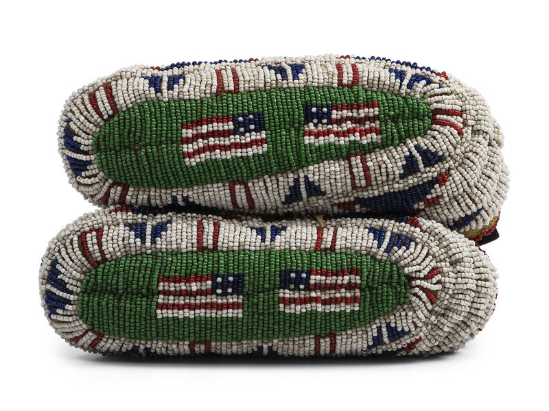 thread and sinew-sewn on softly tanned hide; fully beaded in a patriotic color scheme with pea green accents, featuring a pair of American flag on the vamps and soles
