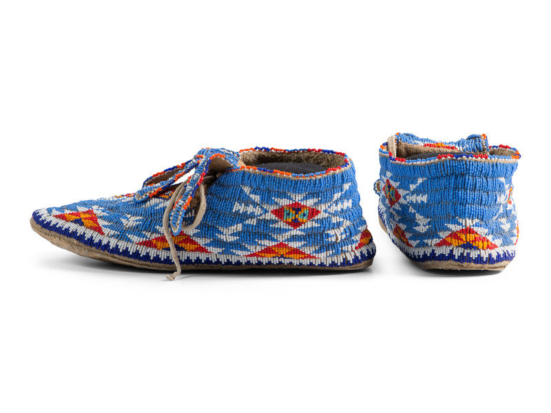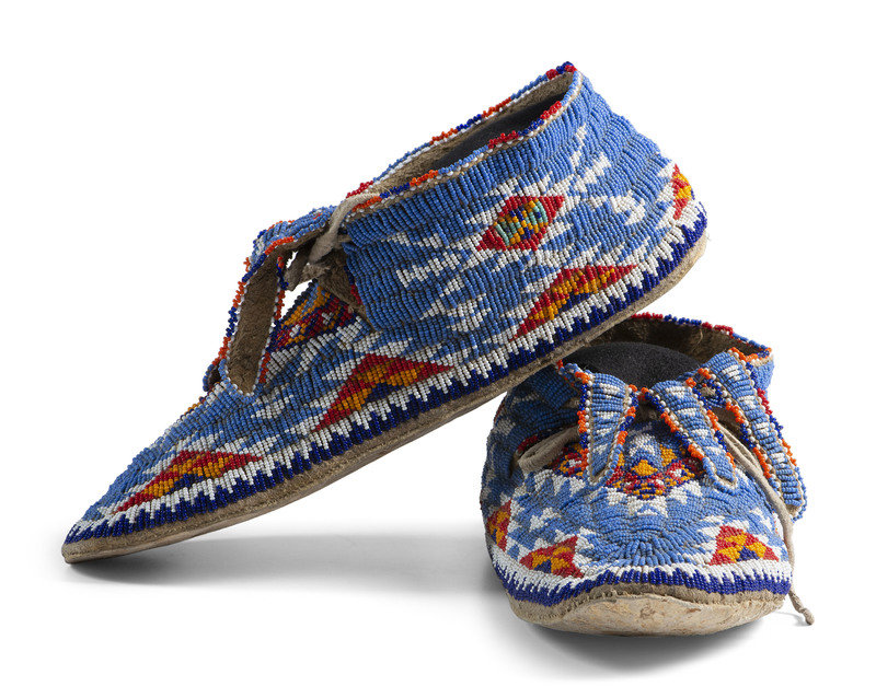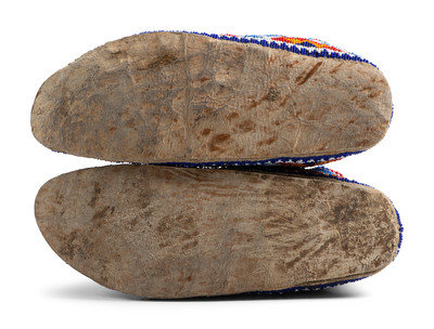thread and sinew-sewn; having a busy design beaded in colors of dark blue, medium blue, orange, red, and white; trifurcated tongue