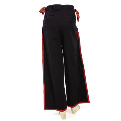 thread and sinew-sewn; 19th-century beaded strips in colors of apple red white-heart, cobalt, light blue, yellow, and white and been repurposed and placed on ca 1930s military wool pants; detailed with red cotton edging; Naval Clothing Factory label sewn to interior and documented to Francis Foley