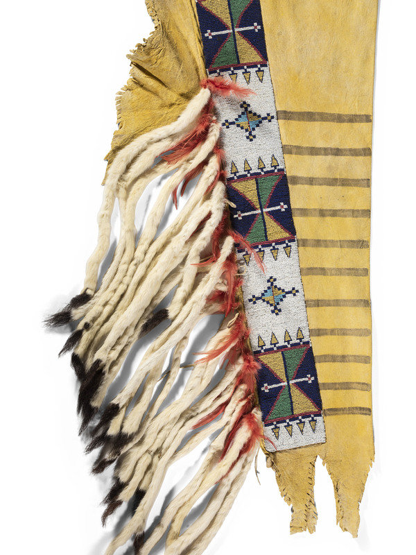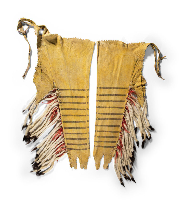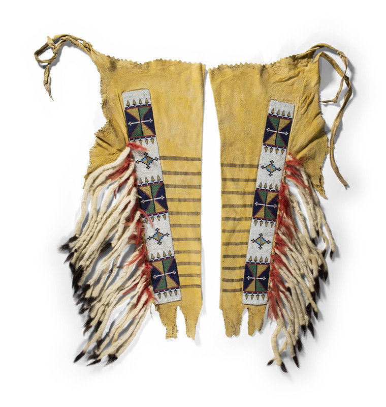 thread and sinew-sewn; each with a panel beaded in colors of red white-heart, greasy yellow, dark blue, light blue, and white; hide coated in yellow pigment and augmented with black horizontal stripes; ermine tails and red-dyed feathers
